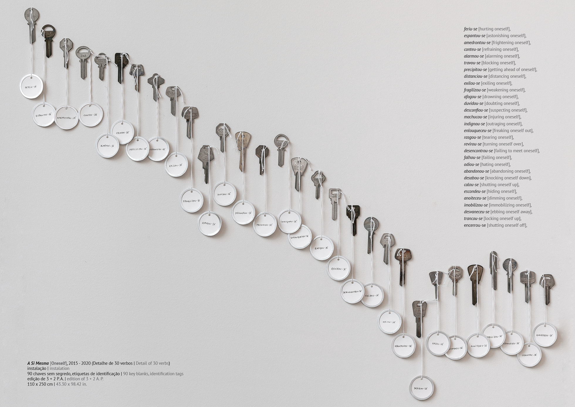 Usei etiquetas de chaves para identificar cada uma das etapas de um longo processo emocional. As chaves “virgens”, ao mesmo tempo que não abrem antigas portas, trazem a potência de transformarem-se em qualquer segredo.