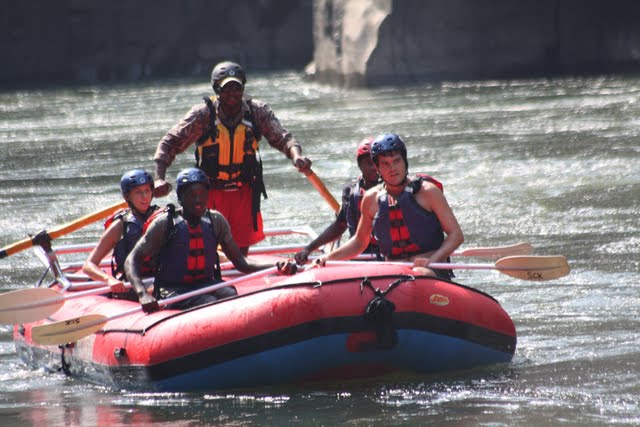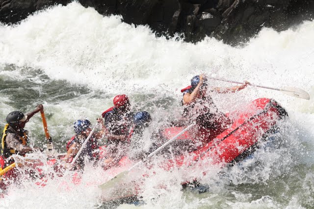 Hoje fizemos rafting no Rio Zambezi, considerado o melhor do mundo para o esporte. O rafting foi realmente sensacional, com 21 quedas e muita adrenalina.