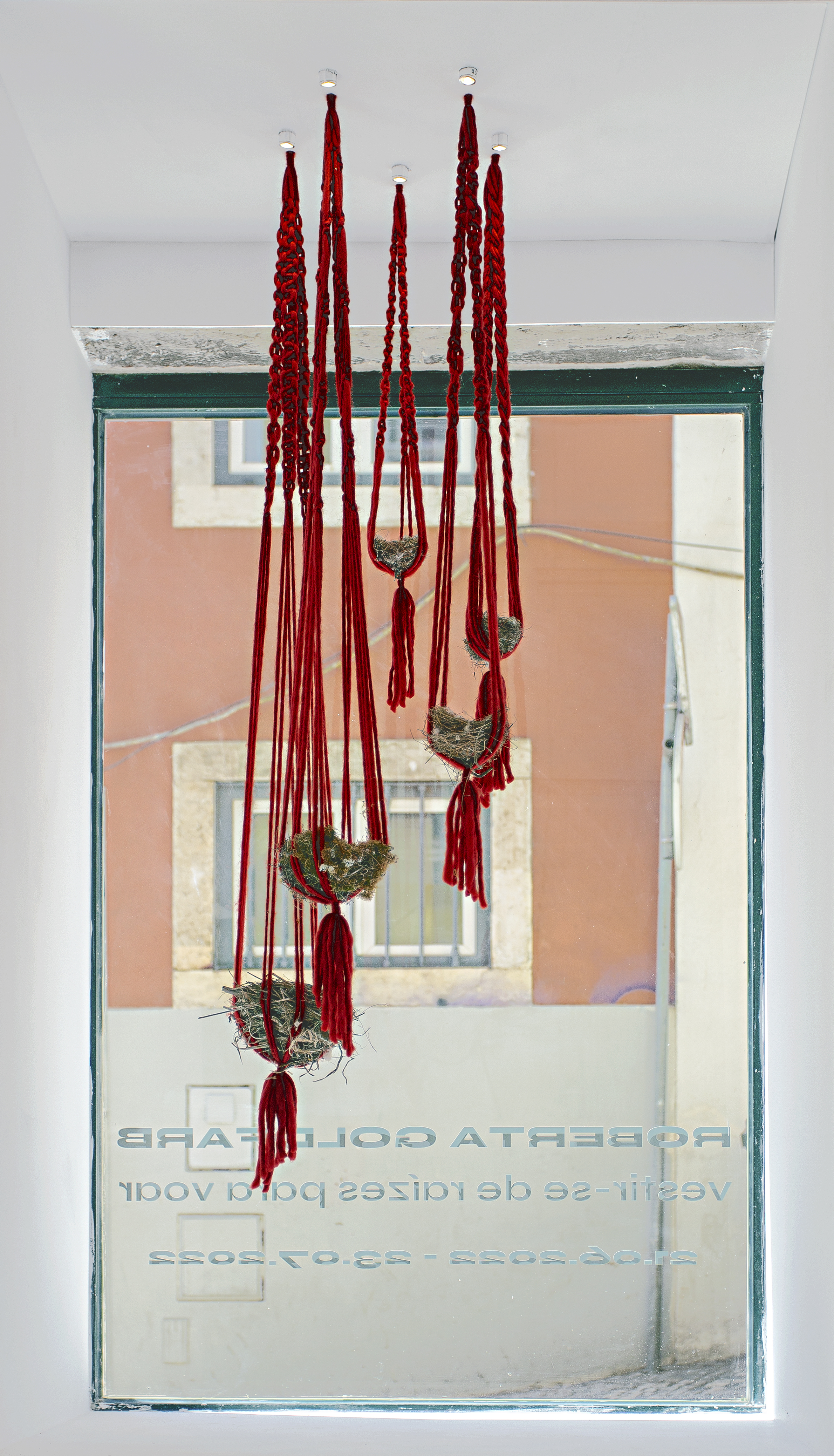 Foi justamente quando o futuro foi suspenso, com a pandemia de COVID-19 e toda a crise desencadeada a partir daí, que o conjunto de obras apresentadas nesta exposição foi criado. Em meio a questionamentos sobre sobrevivência, confinamentos, pulsão de vida, incertezas e as transformações necessárias para a invenção de um novo mundo, Roberta Goldfarb mergulhou ainda mais fundo em sua ancestralidade para vislumbrar o porvir. Sua pesquisa em geral versa sobre uma espécie de taxonomia dos afetos e traz reflexões sobre a condição das mulheres e a maternidade e com esta nova safra amplifica-se para uma discussão sobre matrilinearidade, ecofeminismo e migrações. O corpo da artista é árvore que alimenta seus filhos enquanto é alimentado por suas raízes, numa sobreposição de sutis camadas de imagens feitas por ela em quase uma década. Ao lado dessa grande instalação estão ninhos que acolhem a fusão das batidas do coração coletadas em todas as ultrassonografias feitas em suas gestações com o tambor usado em suas rodas de mulheres.