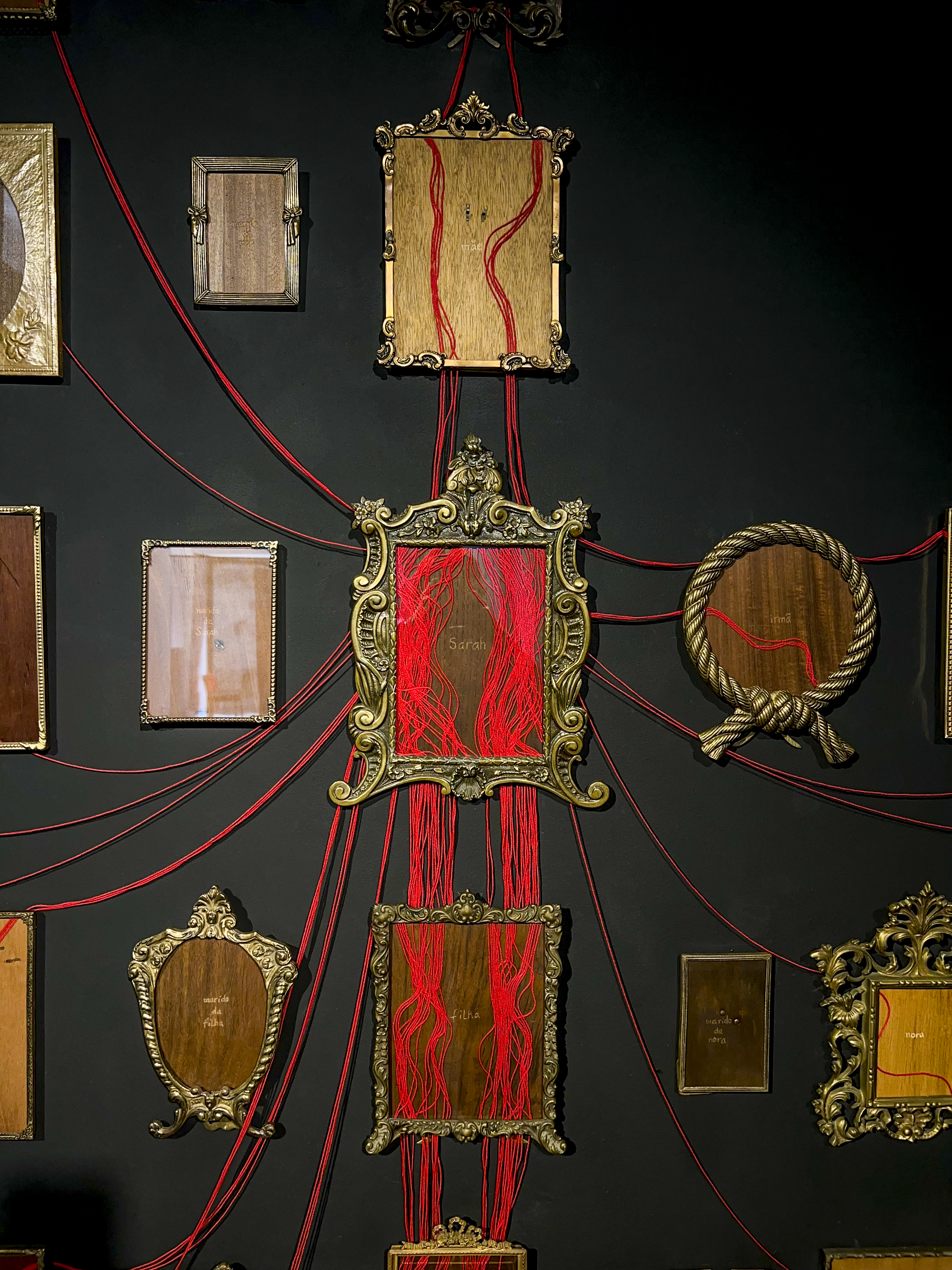 By revisiting the episode of the angel of death that took the lives of all the firstborn in the biblical passage of the 1o plagues of Egypt, the artist personifies the angel of life. Once again, the fabric enters the scene, bringing subtlety to the gestures performed as an angel, bird or butterfly. In nature, birds migrate in search of survival conditions, as well as most humans. In the video Wie Nemt Men a Bissale Mazel (Where toGet a Little Luck) we see remnants of the migratory trajectory from Poland to Brazil made by Sarah (Sura), Roberta's maternal grandmother, in wordstaken from documents found in an extensive research carried out by the artist and stamped on paper. Stamps often decide fates, who lives and who dies, who has the right or not to move to another country. Her grandmother's migration was what gave Roberta the passport to stay in Europe and gave rise to this new perspective on her own history. We started the exhibition with a tree-body (descending) and ended with a tree-womb (ascending/descending). All of humanity was inside the woman's womb is a family tree centered on Sarah, but emphasizing the presence of all the women intertwined in her life: mother, grandmother, sisters, sisters-in-law, daughters, granddaughters, great-granddaughters... we discuss the evilsand consequences of patriarchy for Earth beings and we dream and try to build a transformation in which other values are our guides. Is the turn to matriarchy the solution we heed? What is certain is that without understanding the past we have no future, without honoring women there is no transformation, without recognizing our interdependence with other beings on the planet there is no salvation. As Roberta Goldfarb makes us reflect, we need to dress up as roots so we can fly.